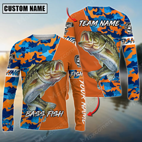Maxcorner Bass Fishing Blue Orange Camo Pattern Personalized 3D Long Sleeve Shirt