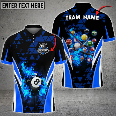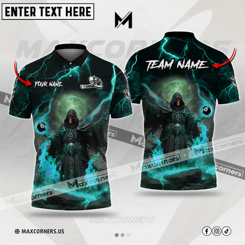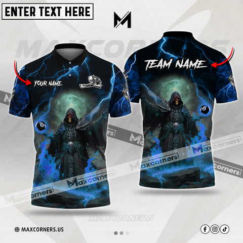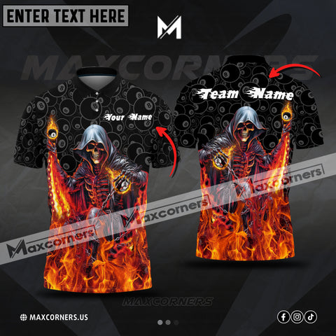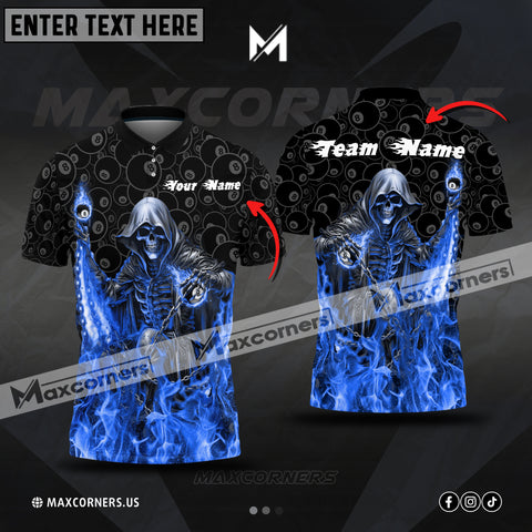 Maxcorners Billiards Skull Flame Fire 8 Ball Pattern Multicolor Options Personalized Name, Team Name 3D Polo - Blue