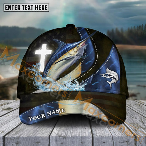 Maxcorners Marlin Fishing Black White Gold Premium Pattern Sport Pattern Personalized Name 3D Cap MT78