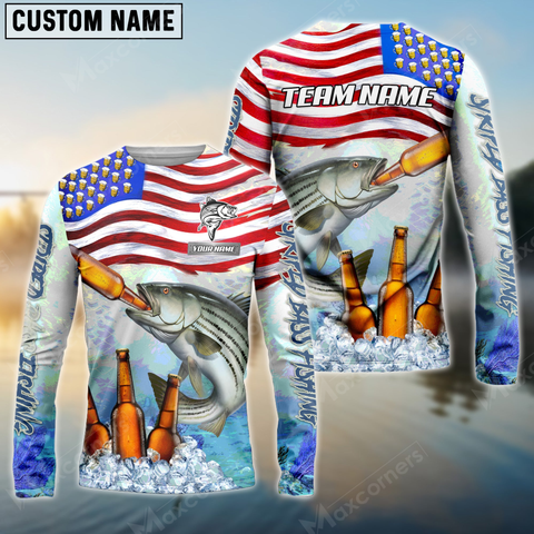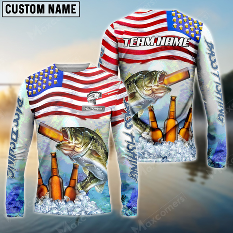 Maxcorners Freshwater Fishing Giant Fish Water Splash American Flag Landscape Personalized Name, Team Name 3D Long Sleeve Shirt - Large Mouth Bass