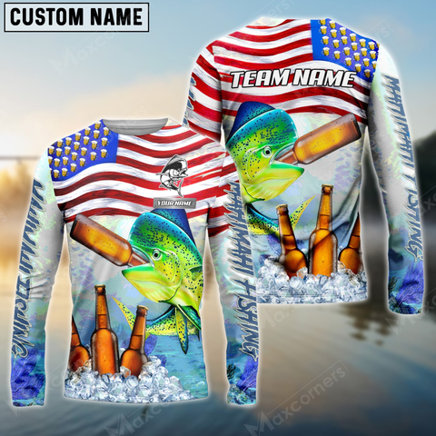 Maxcorners Saltwater Fishing Giant Fish Water Splash American Flag Landscape Personalized Name, Team Name 3D Long Sleeve Shirt - Mahi-mahi